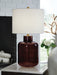 Details Made of glass and metal with drum hardback fabric shade, Brown finish, Metal with goldtone finish, 3-way switch, 1 E26 socket, type A bulb recommended (not included); 150 watts max or LED equivalent; UL Listed, Minor assembly required; simply attach preassembled shade to lamp base