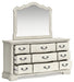 Details B980B2: Includes headboard, footboard and rails, Made with hardwood solids, spruce veneer, MDF substrates and cast resin components , Antiqued white painted finish, Polyester upholstery, Button tufting, Foundation/box spring required, sold separately, Mattress available, sold separately, Assembly required, B980B1: Includes dresser and mirror, Made with hardwood solids, spruce veneer, MDF substrates and cast resin components, Antiqued white painted finish, 9 drawers with fully finished interiors, French and English dovetail construction and ball-bearing side glides, Metal bar pulls with aged pewter-tone finish, Mirror attaches to back of dresser,