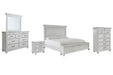 Give your retreat vintage charm with this bedroom set in a beautifully distressed whitewash finish. You'll love the headboard's grand style featuring a picture framed panel. The bench footboard is equally elegant offering extra storage and a convenient seat. Generously scaled moulding, framed drawer fronts and bun feet enhance the character of this bedroom set—evoking the feel of a quaint cottage escape.