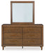 Details B615B6: Includes upholstered panel headboard and footboard , Solid wood frame, Due to the use of natural wood materials, some variations may occur , Frame with medium brown wood tone finish, Polyester upholstery, Tapered legs, Foundation/box spring required, sold separately , Mattress available, sold separately, Assembly required, B615B1: Includes dresser and mirror, Made with hardwood solids, mango wood veneer and MDF substrates, Medium brown wood-tone finish, 6 drawers with fully finished interior, dovetail construction and heavy duty ball-bearing side glides, Round tapered legs, Mirror attaches to back of dresser, B615-46: Made with hardwood solids, mango wood veneer and MDF substrates, Medium brown wood-tone finish, 5 drawers with fully finished interior, dovetail construction and heavy duty ball-bearing side glides, Round tapered legs, B615-92: Made with hardwood solids, mango wood veneer and MDF substrates, Medium brown wood-tone finish, 2 drawers with fully finished interior, dovetail construction and heavy duty ball-bearing side glides, Round tapered legs, 110V power supply with USB-A and USB-C charging ports, Power cord included; UL Listed,