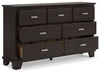 Feast your eyes on this richly versatile dresser. Its traditional-inspired dark brown finish effortlessly blends with contemporary bright nickel-tone pulls to create a stunning look that's not too stuffy or too trendy. Spacious drawers offer plenty of storage for your wardrobe and spare bed linens.