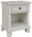 Elegant, timeless furnishings take your bedroom to the next level. Nothing does that better than this nightstand. The antiqued white finish with a wonderful grain texture radiates sophistication, while a dark bronze-tone knob adds an ornate touch. A single drawer and open bookcase cubby allow for versatile storage or display options, making this nightstand a functional favorite.