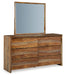 Details B790B5: Includes panel headboard, panel footboard, rails and slats , Made with sheesham wood, veneer and MDF substrate, Clear natural wood-tone finish , Headboard with beveled frame, Foundation/box spring required, sold separately , Mattress available, sold separately, Assembly required, B790B1: Includes dresser and mirror, Made with sheesham wood, veneer and MDF substrate, Clear natural wood-tone finish , Front frame with thick beveled edge, 6 smooth-gliding drawers with fully finished interior, dovetail construction and heavy duty ball-bearing side glides, Mirror attaches to back of dresser,