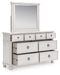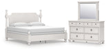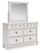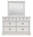 Details PCB823B4: Includes headboard/footboard panels, posts and poster rails , Made with hardwood solids, veneers and MDF substrates , Side rails feature laminated solid hardwood slat support rails (or LVL) with glued and screwed blocking for added strength, Rubbed antiqued white finish , Foundation/box spring required, sold separately, Mattress available, sold separately , Assembly required, PCB823B1: Includes dresser and mirror, Dresser made with hardwood solids, veneers and MDF substrates , Mirror made with solid wood, Rubbed antiqued white finish, Metal hardware with pewter-tone finish, 8 smooth-gliding drawers with fully finished interiors, French/English dovetail construction and heavy-duty ball-bearing side glides, Top drawers felt lined, Mirror attaches to back of dresser,