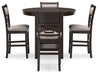 Details Includes counter height dining table and 4 upholstered bar stools, Table made with rubberwood solids, mindi veneer and MDF substrates, Stool made with solid wood and engineered wood, Cherry brown finish, Tabletop has reverse diamond patterned veneer, Thick tapered legs, 2 lower shelves, Stool with light beige polyester upholstery, Foam cushion seat and backrest, Stool backrest features fretwork accent, Seats up to 4, Assembly required