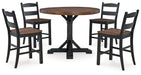 | Details | D546D21: Includes dining table top and base, Made with pine solids, pine veneer and engineered wood substrate, Rustic black finish on base, Rustic brown finish on tabletop, Sturdy post and bracket base design, Assembly required, D546-724: Made with hardwood solids, Distressed black frame, Solid pine seat with rustic brown finish, Contoured seat for comfort, Front legs with adjustable levelers, Assembly required, | |