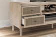 Clean-lined and contemporary—but far from stark—this TV stand is a fresh style awakening. Pairing a light finish with replicated oak grain and textured beige cane details, its mixed materials bring a naturally versatile vibe to your favorite spot for binge-watching or gaming. Sleek, simple hardware plays perfectly with the modern aesthetic. And prepare to have your mind blown by the vast universe of storage possibilities within the spacious drawers and open shelving.
