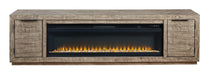This extra-large TV stand with fireplace insert is sure to win your heart with its daring take on modern rustic expression. Its crisp, clean minimalist-chic profile is enriched with striking pine wood grain and a weathered gray finish with distressed saw mark texture. For your added viewing pleasure, the wide fireplace insert gives you the cozy feel of a fireplace without the added hassle. With the touch of a button, adjust the temperature and the color-changing flames, and set the timer for long-lasting enjoyment. It comes with faux glass crystals and natural stones, so you can customize the look of the flame bed.