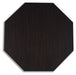 Details Made with mango wood veneer and MDF substrates, Dark espresso brown finish, Octagonal top, Trapezoid-shaped legs set on round plinth base, Assembly required