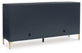 | Details | Made with solid wood, engineered wood and cast resin components, Dark blue finish, Goldtone metal legs, Door fronts with geometric pattern, 4 doors with magnetic push latch function, 2 adjustable shelves, Openings in back for electronics, Minor assembly required, simply lay flat and attach feet | |