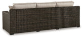 Who says the great outdoors isn’t made for luxury living? This sofa with cushion offers all the high-end design, plush comfort and durability you could ask for, and then some. Its all-weather, rust-proof aluminum frame provides the easy-breezy wicker look you love without the high maintenance. Rest assured, the high-performing Nuvella® fabric covering the cushions and throw pillows is made to stand up to the elements.