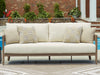 Elevate the appeal of easy-breezy living with this outdoor sofa. Made to look like wood yet durable enough to weather the elements, it's sure to serve you and your besties well, year after year. The gently curved piece features cushions wrapped in Nuvella+™ high-performance fabric for plush refinement. Patterned accent pillows infuse delightful texture.