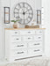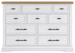 Casual style with substance. This two-tone dresser raises the bar on comfortably cozy design in your soothing sanctuary. A sturdy silhouette with a classic white finish and black metal hardware exudes modern farmhouse vibes. The butcher block oak veneer top adds a relaxed aesthetic. And this charmingly curated piece is spacious enough for all your essentials.