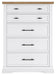 Casual style with substance. This two-tone chest of drawers raises the bar on comfortably cozy design in your soothing sanctuary. A sturdy silhouette with a classic white finish and black metal hardware exudes modern farmhouse vibes. The butcher block oak veneer top adds a relaxed aesthetic. And this charmingly curated piece is spacious enough for all your essentials.