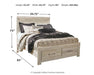 | Details | Includes headboard, footboard, rails and slats, Made of engineered wood (MDF/particleboard) and decorative laminate, Wispy white finish over replicated oak grain with authentic touch, Footboard with 2 smooth-operating drawers, Bed does not require additional foundation/box spring; accommodates most zero clearance adjustable bases with the addition of a bunkie board, Mattress available, sold separately, Assembly required | |