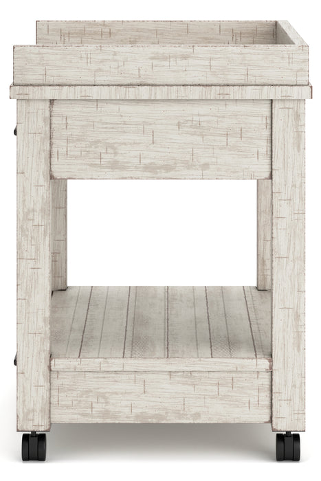 | Details | Made of pine veneers, pine wood and engineered wood, Distressed whitewash finish, 2 smooth-gliding drawers with dovetail construction, 2 open shelves, Vintage patinated bronze-color hardware, Casters for mobility, 2 electrical outlets and USB charging ports, Power cord included; UL Listed, Assembly required | |