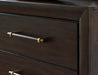 Details Includes dresser and mirror, Dresser made with hardwood solids, birch veneer and MDF substrate; mirror made with solid wood, Merlot finish, Solid wood pulls with brass-tone metal accents, 6 smooth-gliding drawers with fully finished interiors, French/English dovetail construction and heavy-duty ball-bearing side glides, Top drawers felt lined, Round tapered legs, Mirror attaches to back of dresser