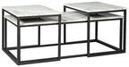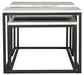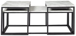 Details Made of decorative laminate, engineered wood and metal, Set of 3, Faux Carrera marble top and shelf, Nesting design, Tubular metal frame with black powder coated finish, Assembly required