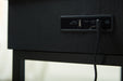 Details Made with engineered wood, glass and metal, Metal frame with black finish, Polyester fabric in black, Fixed lower shelf, Glass tabletop with wireless charging and touch-button controls, Two 3" full-range speakers; two 1" tweeter speakers; 5.25” subwoofer, Wireless connectivity; aux audio input; MP3 port, USB-A and USB-C charging ports, LED light effect on top, Power cord included; UL Listed