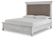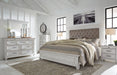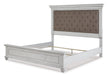 | Details | Includes queen upholstered headboard, panel footboard and rails, Made with solid wood, veneers and engineered wood, Distressed whitewash finish, Button tufted fabric upholstery, Nailhead trim, Foundation/box spring required, sold separately, Mattress available, sold separately, Assembly required | |