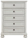 Elegant, timeless furnishings take your bedroom to the next level. Nothing does that better than this chest of drawers. The antiqued white finish with a wonderful grain texture radiates sophistication, while dark bronze-tone knobs add an ornate touch. Felt finishing in the upper drawers rounds out this tasteful piece.