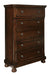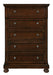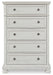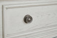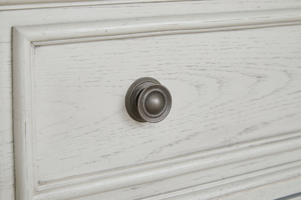 Details Made with select oak veneer, engineered wood, solid wood components and cast resin components, Antiqued white finish with grain texture, Dark bronze-tone knobs, 5 smooth-gliding drawers with dovetail construction with metal ball bearing side glides, Upper drawer with felt bottom